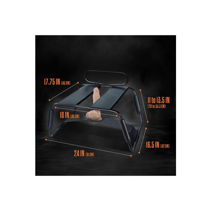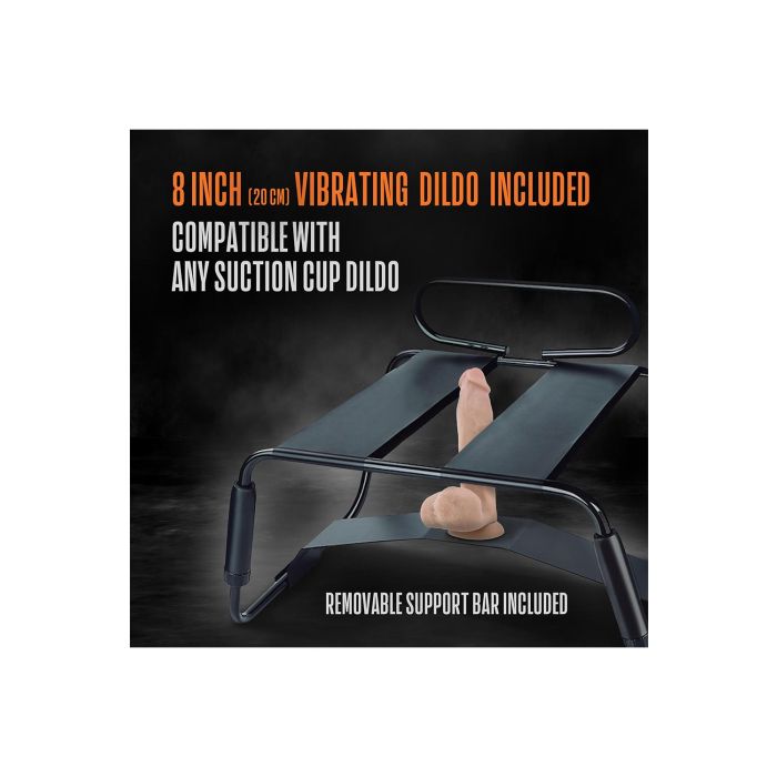 Het opzetten is binnen enkele minuten gedaan, en de ingebouwde handvatten geven je extra stabiliteit en controle. Zo kun je de penetratie en stoten precies afstemmen terwijl je comfortabel zit op de twee sterke elastische banden die tot 136 kg dragen. De stoel is compatibel met alle zuignapdildo’s en vibrators en wordt geleverd met een realistische 20 cm vibrerende dildo om direct te gebruiken.