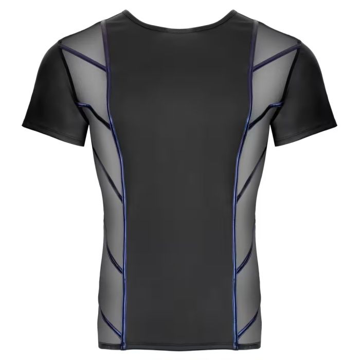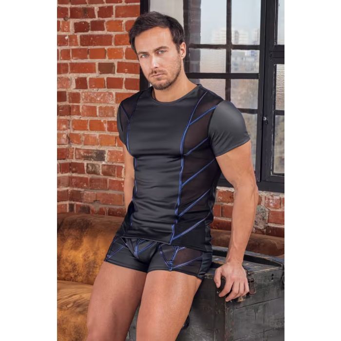 Met zijn opvallende transparante zwarte mesh inzetstukken aan de zijkanten, biedt het een speelse twist die je outfit naar een hoger niveau tilt. De diagonale strepen in een blauw metallic matte look voegen een vleugje flair toe, waardoor je zeker de aandacht zult trekken, waar je ook gaat.
