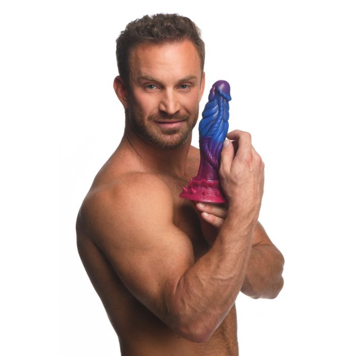 Deze fantasie dildo is perfect voor liefhebbers van het bovennatuurlijke met zijn kosmische uitstraling. De prachtige en rijke blauwe, paarse en roze kleuren springen eruit te midden van de duisternis van de nacht. Kijk van dichtbij en je zult de glitter zien die een met sterren bezaaide hemel nabootst. De ronde, fallische kop is gemakkelijk naar binnen te brengen. Terwijl je het inbrengt, geniet van de grote bobbels, de touwachtige lijnen en de dikke richel langs het midden. De talrijke texturen voegen schitterende stimulatie toe terwijl de omvang en grootte je openen om je plezierzintuigen te vergroten!