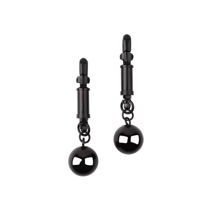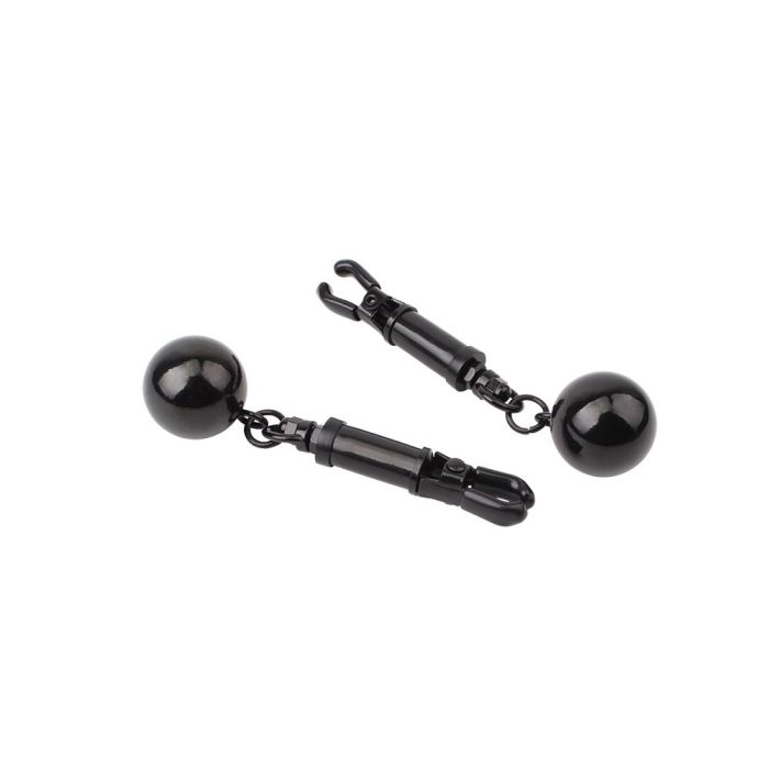 Deze clamps zijn ontworpen met zachte rubberen tips die een comfortabele, maar stevige grip bieden, waardoor ze perfect passen rond je gevoelige tepels. Het strakke zwarte ontwerp, aangevuld met elegante balletjes als gewichten, voegt niet alleen een vleugje verfijning toe aan je intieme momenten, maar omarmt ook een speelse kinkiness die je ervaring naar een hoger niveau tilt.