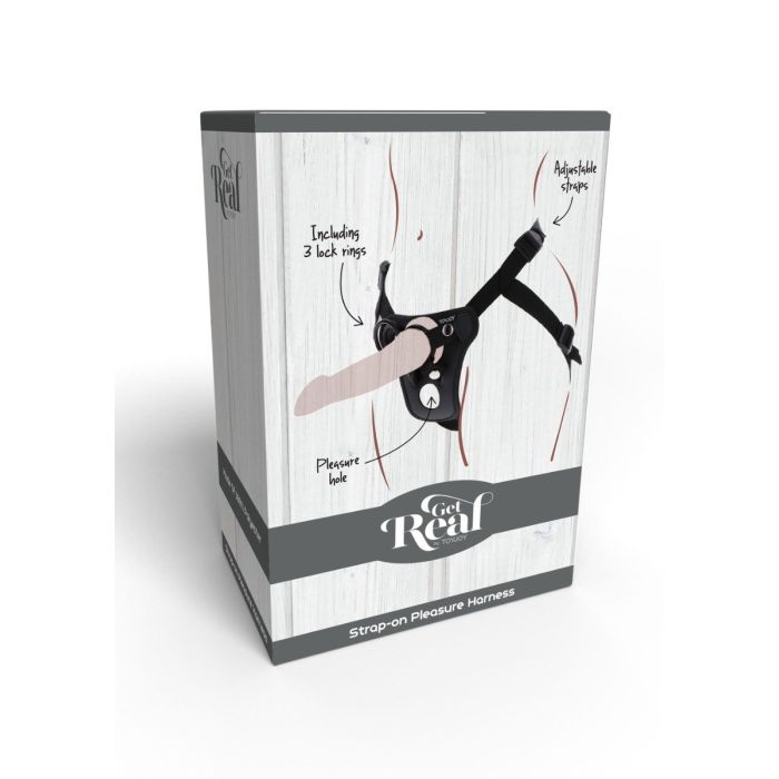 Ervaar ultiem rollenspel met de Strap-On Harness Pleasure van Get Real by Toyjoy. Dit comfortabele harnas heeft een gewatteerd voorste kussen en verstelbare sluitingen, zodat het perfect aansluit. Inclusief drie siliconen ringen (3,5, 4,5 en 5 cm) om jouw favoriete dildo of vibrator stevig op zijn plek te houden.