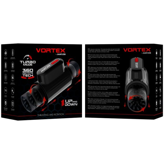 Maak kennis met de JAMYJOB VORTEX up and down masturbator, een luxe genotsspeeltje dat je zintuigen op een ongekende manier prikkelt. Met zijn strakke zwarte design en dieprode accenten is deze masturbator niet alleen een lust voor het oog, maar ook een meesterwerk van technologie. Geniet van maar liefst 10 verschillende stoot- en rotatiestanden, waarmee je de intensiteit van je ervaring volledig kunt afstemmen op je persoonlijke voorkeuren. Of je nu houdt van zachte strelingen of krachtige vibraties, de VORTEX heeft het allemaal. En met de ingebouwde 'turbomodus' ben je verzekerd van een extra spannende ervaring die je niet snel zult vergeten.