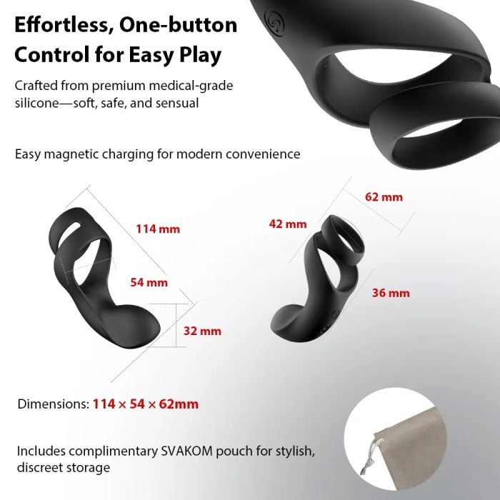 De Svakom Benedict is een vibrerende cockring voor mannen die meer controle én meer intensiteit willen ervaren. De krachtige motor levert diepe, gerichte trillingen die het perineum extra stimuleren terwijl de ring helpt om het orgasme langer uit te stellen. Zo hou jij het langer vol en bouw je de spanning maximaal op.