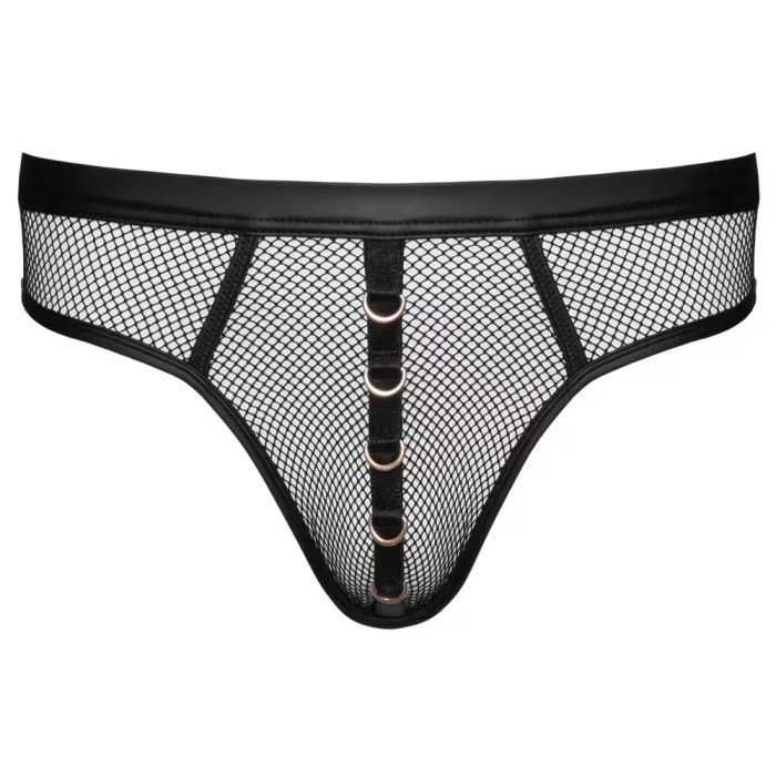 Gemaakt van luchtig netmateriaal, biedt deze onderbroek niet alleen een verleidelijke uitstraling, maar ook een trendy wetlook die je zelfvertrouwen een boost geeft. De vijf decoratieve goudkleurige ringen op het zakje zijn niet alleen een speelse toevoeging, maar geven ook een verfijnde touch die je look naar een hoger niveau tilt.