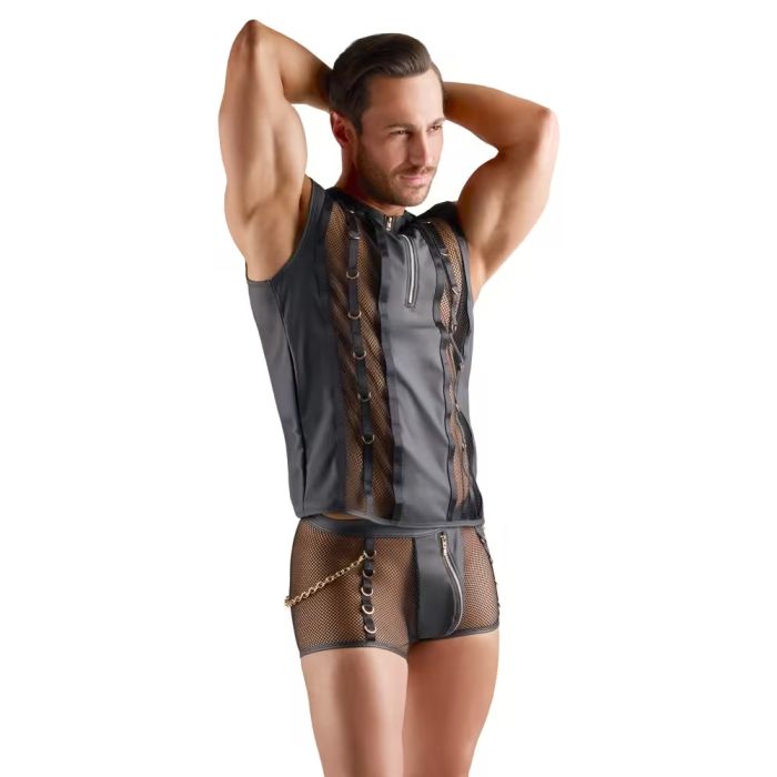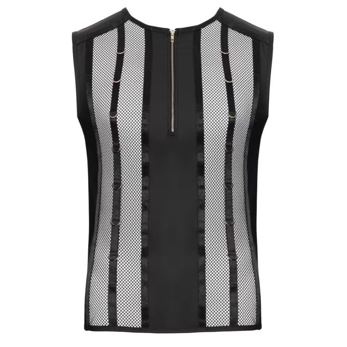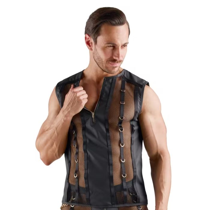 Dit shirt is gemaakt van een onthullend netmateriaal dat perfect samengaat met een trendy wetlook, waardoor je een gedurfde en modieuze uitstraling krijgt. Het elastische en zachte materiaal voelt heerlijk aan op de huid, wat zorgt voor een ongeëvenaard draagcomfort. De goudkleurige korte ritssluiting aan de voorkant voegt een vleugje luxe toe, terwijl de decoratieve goudkleurige ringen aan de zijkanten en boven op de rug een speelse en verleidelijke touch geven.