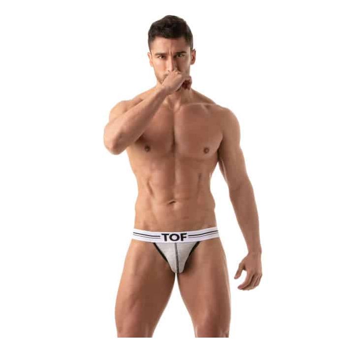 De elastische tailleband, die laag op de heupen valt, accentueert je vormen op een flatterende manier en is voorzien van het herkenbare TOF Paris logo. Dit geeft niet alleen een sportieve uitstraling, maar zorgt ook voor extra ondersteuning. De open achterkant met witte elastische banden geeft je billen een subtiele lift, waardoor je een uitdagende en zelfverzekerde look creëert. Perfect voor onder je dagelijkse outfit of voor een speciale gelegenheid, deze jock strap is de ideale combinatie van functionaliteit en flair.