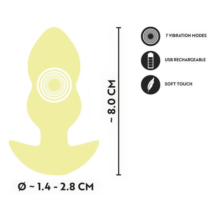 De Vibrerende Mini Butt Plug Geel van Cutie is perfect voor zowel beginners als ervaren gebruikers die hun grenzen willen verleggen. Dankzij het lichte ontwerp en de smalle top glijdt de hoogwaardige siliconen plug moeiteloos naar binnen, waardoor het inbrengen een fluitje van een cent is. De zachte gradaties en gegroefde structuren zorgen voor een opwindende zintuiglijke ervaring die je zintuigen prikkelt en je fantasie aanwakkert. Met maar liefst 7 intense vibratiestanden kun je eenvoudig de perfecte setting kiezen voor jouw avontuur - druk gewoon op de knop en laat je verrassen door de verschillende sensaties! Het zachte siliconen materiaal voelt heerlijk aan op de huid en de ergonomische ankerstop zorgt voor een veilige en comfortabele pasvorm, zodat je je volledig kunt overgeven aan het genot. Bovendien is deze plug oplaadbaar, inclusief een handige USB oplaadkabel, wat betekent dat je altijd klaar bent voor een spannende reis vol plezier en ontdekking. Maak je klaar om je grenzen te verleggen en geniet van intens achterdeurplezier met deze onweerstaanbare mini butt plug!