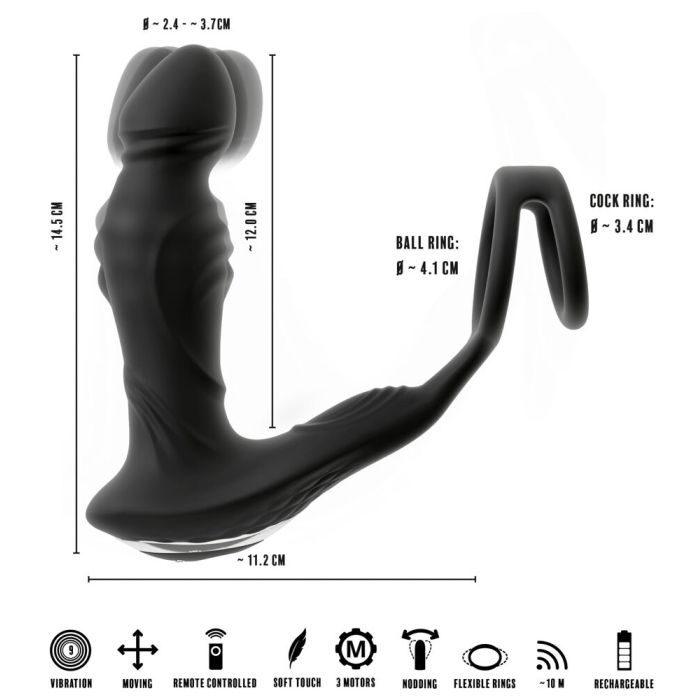 De RC Vibrerende Prostaatplug van Rebel is niet alleen een prostaatvibrator, maar ook een perineum-oplegvibrator en penis-/testikelringen in één. De knikkende vibrerende tip is speciaal ontworpen om je prostaat op een unieke manier te stimuleren, terwijl de bewegende ringen je anale kanaal masseren en de krachtige trillingen een heerlijke tinteling aan je perineum geven. Met maar liefst 3 krachtige, stille motoren en 19 verschillende standen, kun je eenvoudig de perfecte combinatie van trillingen en massages vinden die bij jouw wensen passen. Gemaakt van hoogwaardig, ergonomisch siliconen, biedt deze prostaatplug niet alleen maximaal comfort, maar ondersteunt ook je erectie optimaal. Dankzij de handige afstandsbediening kun je solo of samen met een partner genieten van dit intensieve anale plezier. Bovendien is de plug oplaadbaar met een USB-kabel en wordt hij geleverd met een batterij voor de afstandsbediening, waardoor dit speeltje een onmisbare aanvulling is op je slaapkameravonturen!