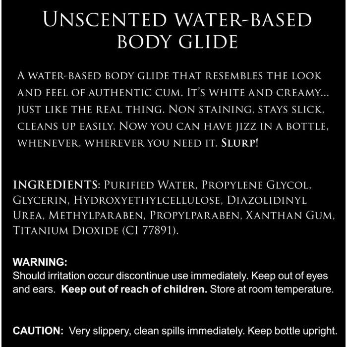 De Jizz Body is een revolutionair watergebaseerd glijmiddel dat de textuur van sperma perfect nabootst voor een authentieke en natuurlijke ervaring. Met zijn romige, witte consistentie biedt deze geurvrije formule een langdurige gladheid die je intieme momenten naar een ongekend niveau tilt. Geen zorgen over vlekken of rommel, want Jizz Body laat geen sporen achter en is eenvoudig af te spoelen met water en zeep. Dit glijmiddel is speciaal ontworpen voor extern gebruik, zodat je je volledig kunt concentreren op de plezierige momenten zonder afleiding. Voor een optimale gebruikservaring, houd de fles rechtop en geniet van een soepele, zorgeloze ervaring met Jizz Body – de perfecte aanvulling voor je intieme leven!